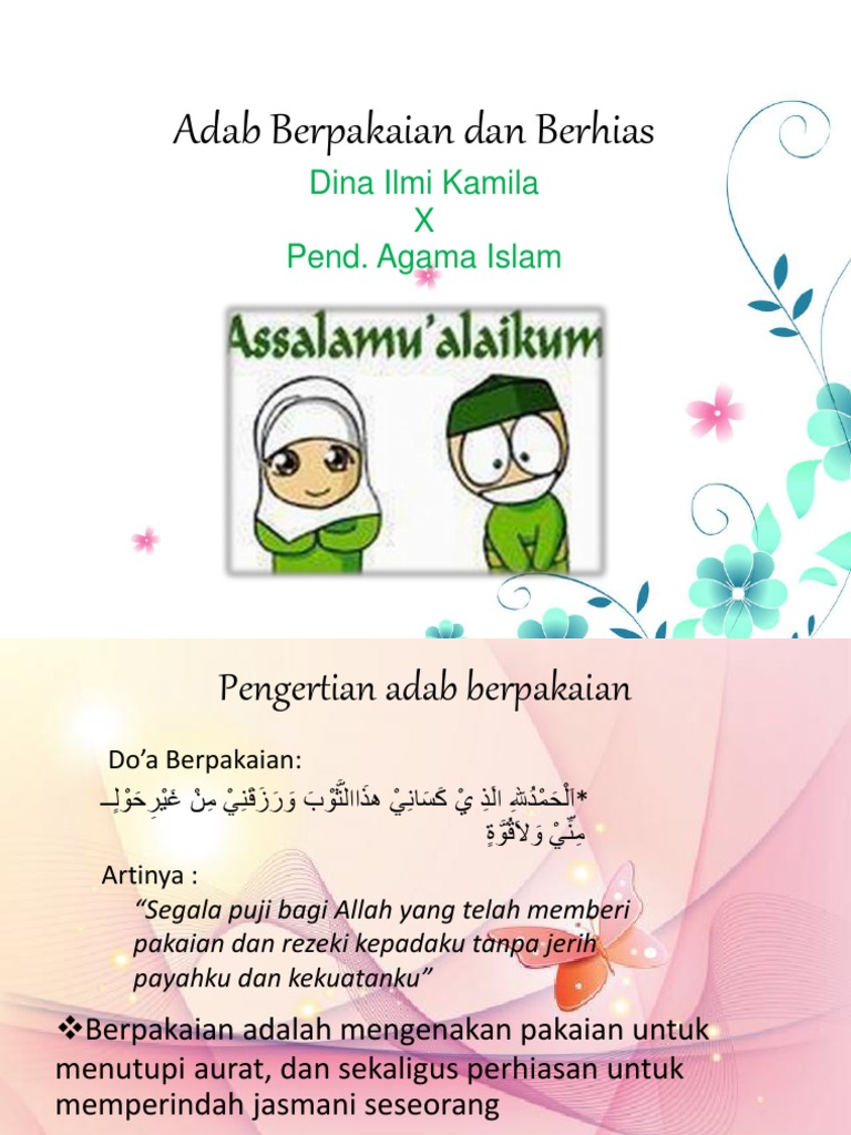 Adab umum dalam berpakaian 1. Adab berpakaian dalam islam di antara amalan yang mulia bagi manusia ialah mengikuti akhlak dan adab rasulullah shallallahu alaihi wasallam. Tata cara berpakaian secara islami pakaian merupakan salah satu kebutuhan pokok manusia selain makanan dan tempat tinggal. Salah satu adab yang dianjurkan untuk diperhatikan adalah adab memakai pakaian atau etika berpakaian sesuai ajaran agama islam.
