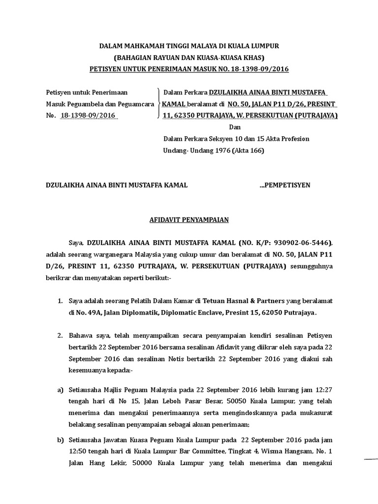 Affidavit penyampaian borang 1 2. Deraf perintah short call blank. Borang 1 is a petition for admission as an advocates and solicitors of high court of malaya. We still have to file our affidavit of service aos in high court proving that you have already served. In borang 3 4 5 your master is the applicant pemohon as opposed to borang 1 2 which you are the petitioner pempetisyen.