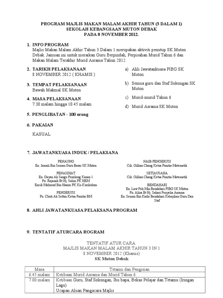 Aturcara majlis makan malam perpisahan. 11 november 2010 tempat. Boleh tak buatkan teks pengacaraan majlis maulidur rasul merangkap majlis perpisahan aturcara majlis bacaan doa bacaan quran bacaan berzanji dan selawat nasyid ucapan gb ucapan pengerusi badan kebajikan sekolah. Menjayakan majlis makan malam di ukay perdana. Dewan anggerik 7 40 pagi p p berjalan seperti biasa 12 00 tgh ketibaan tetamu dan dif dif jemputan 12 15 tgh ucapan alu aluan pengerusi kelab warga smtkk 2010 ustaz wan ahmad tarmizi hj wan daud.