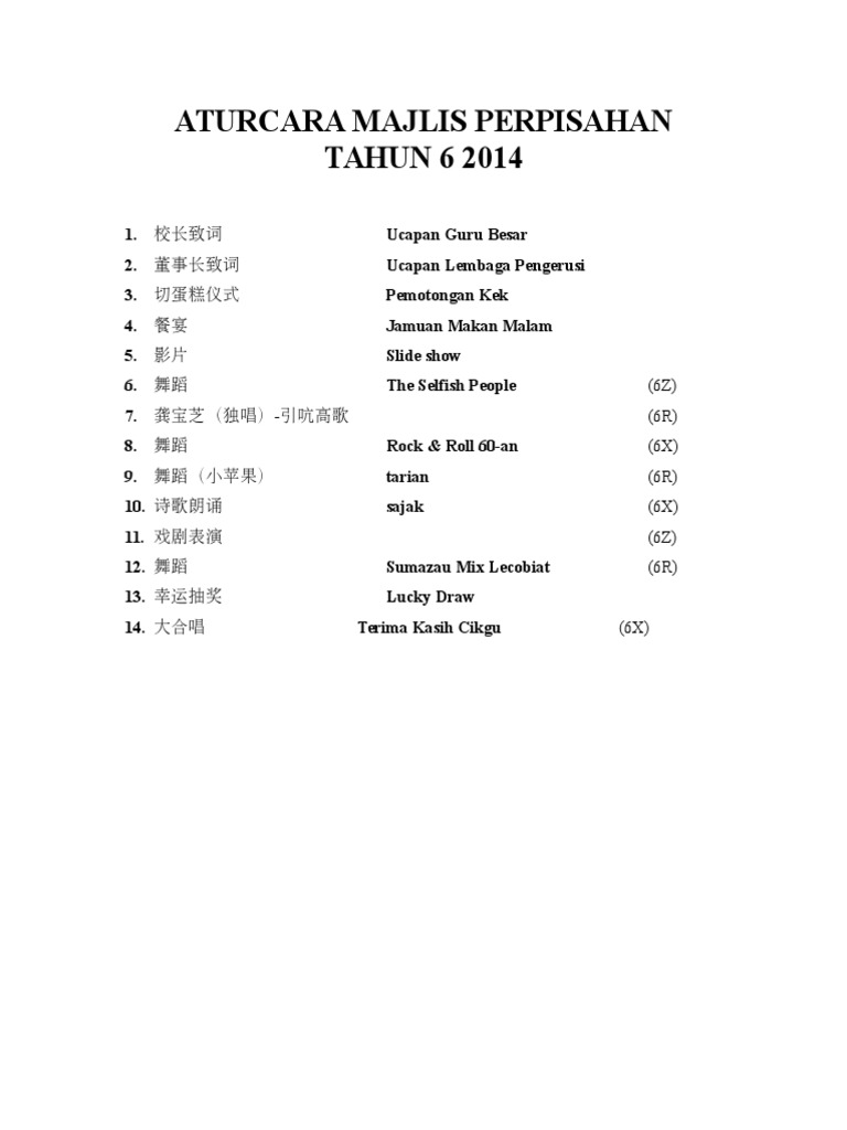 Bacaan doa ucapan wakil pelajar tahun 5 ucapan perasmian oleh dekan fakulti pergigian ukm 9 15 malam. Aturcara majlis perpisahan pengetua guru dan staff smtkk serta jamuan akhir tahun 2010 tarikh. Kita teruskan majlis pada malam ini dengan acara yang ditunggu tunggu iaitu. Persembahan pembukaan 8 45 malam.