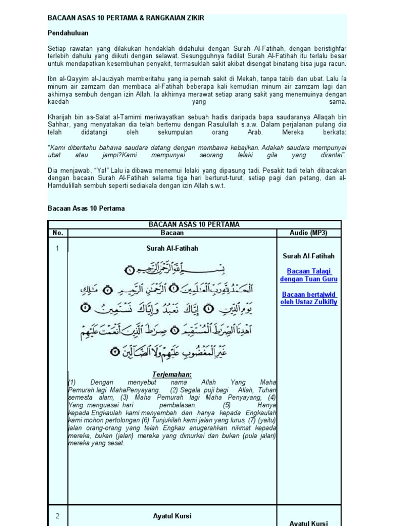 Audio mp3 1. Bacaan asas 10 pertama kegunaannya setiap rawatan yang dilakukan hendaklah didahului dengan surah al fatihah dengan beristighfar terlebih dahulu yang diikuti dengan selawat. Ruqyah asas perubatan pengubatan islam darussyifa bacaan ruqyah asas pertama qari. Bacaan audio mp3 1 surah al fatihah surah al fatihah bacaan talaqi dengan tuan guru bacaan bertajwid oleh ustaz zulkifly terjemahan.