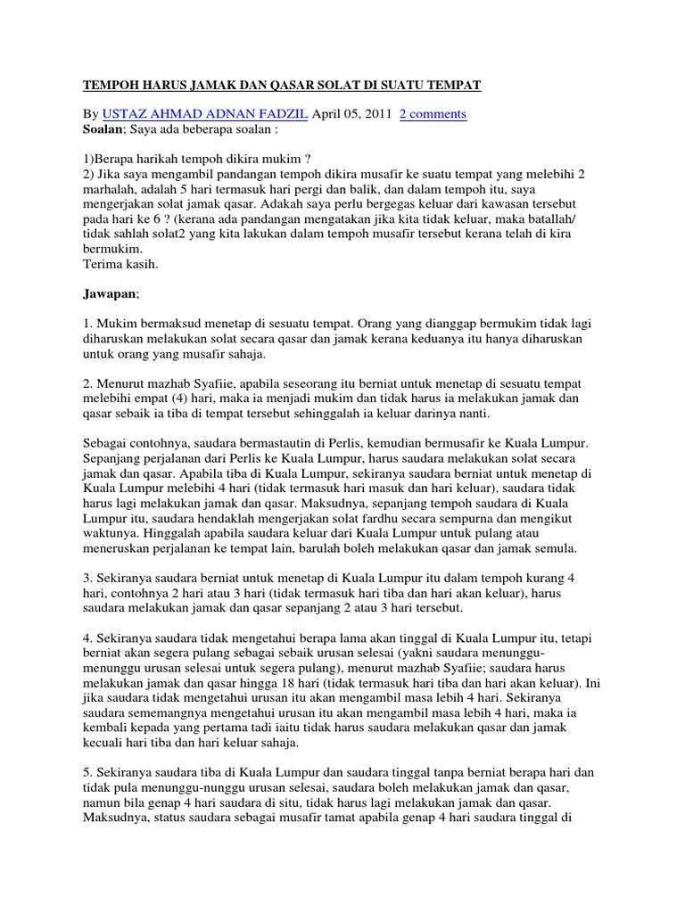Kalau dikaitkan dengan safat maka macet yang sering kita alami tidak memenuhi syarat karena dari segi jarak tidak memenuhi standar minimal. Bolehkah kita solat jamak dan qosor pada saat musafir tetapi mukim selama 5 hari. Orang yang bepergian jauh dan kiranya tidak mampu melewati waktu waktu shalat dengan pasti. Lulusan kejuruteraan kapal terbang tak kesal kerja tukang kayu.