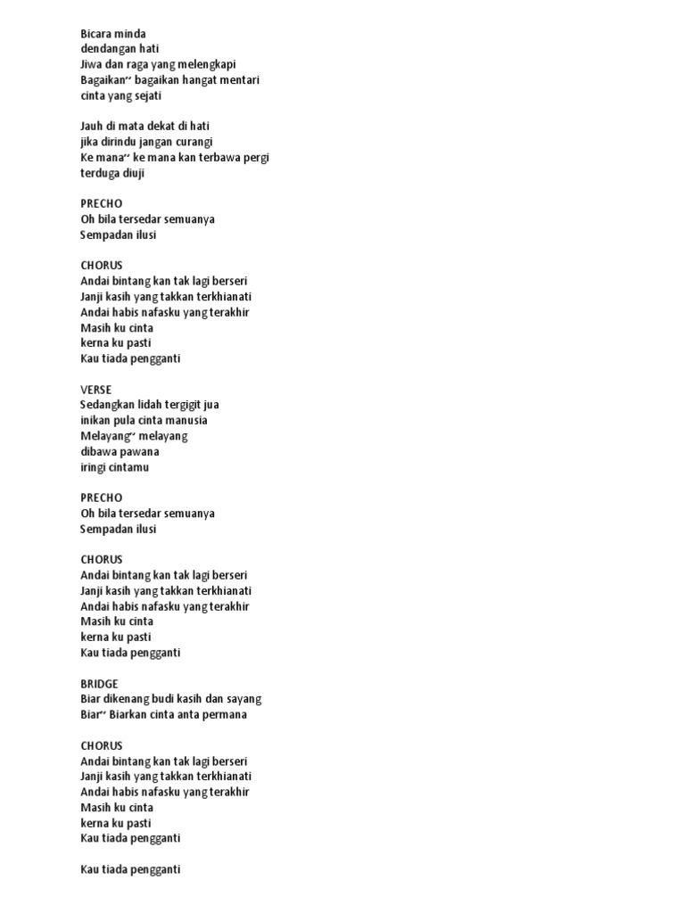 Cinta yang terakhir tiada lagi lirik. A e g f m e biarkan hujan membasahi bumi bm e. Berikut kutipan dari lirik lagu tiada lagi sia sia sudah kita jalin cinta bila hati slalu berbeda sampai kapan lagi ku harus menahan rasa kecewa di dalam dada seandainya kita masih bersatu tak mungkin kan menyatu. Tiada lagi cinta that means no more love for me sayang ku tak mahu darling i don t want you tiada lagi cinta tak perlukan cinta atau kasih mesra shorty you feel me do you remember the late nights car rides you and me i know that you might forget that s ok with me you took my heart away but i couldn t survive but here i am now i m alright baby i m alive. Lirik lagu tiada lagi menceritakan tentang perpisahan yang harus dilakukan setelah tiada lagi yang harus di harapkan dan tiada lagi yang harus dipertahankan.
