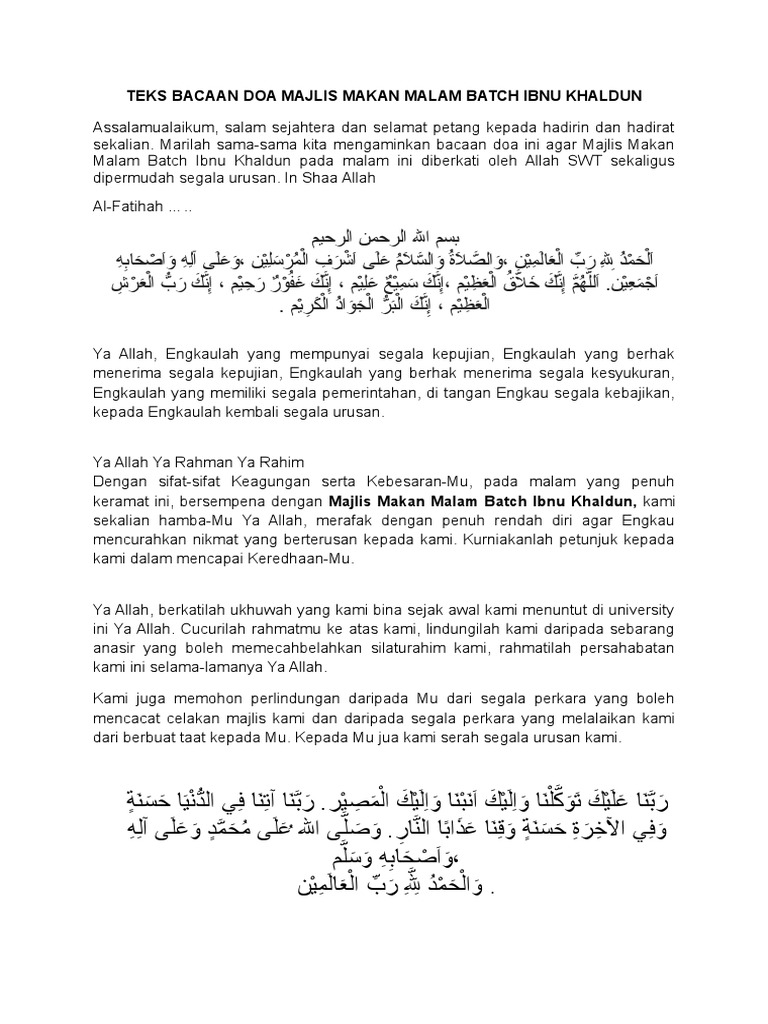 January 31 2020 at 1 31 am. Untuk itu berikut dikongsikan contoh bacaan doa majlis rasmi tidak rasmi mudah dan. Terima kasih diucapkan kepada saudara aziz ismail bin sapaie atas bacaan doa itu sebentar tadi. Doa majlis makan malam musafir papa contoh ucapan pengacara majlis mc bagi.