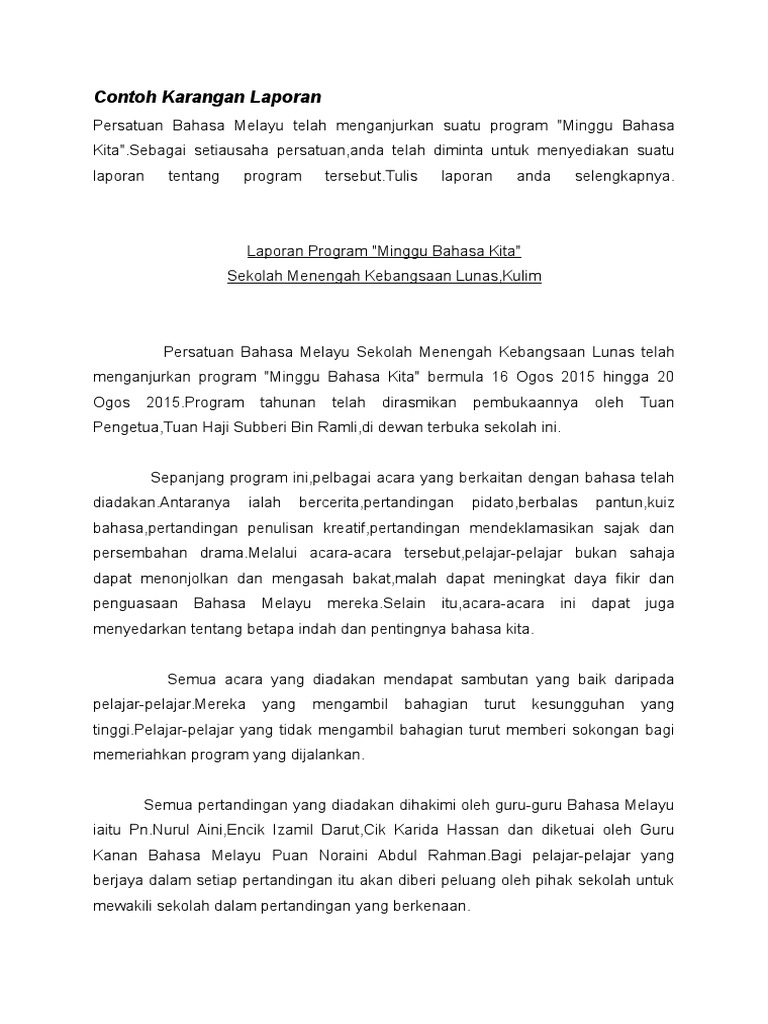Salin semula contoh karangan laporan di bawah. Related posts to contoh karangan laporan aktiviti minggu bahasa melayu contoh karangan laporan aktiviti minggu bahasa melayu 2017 09 28t18 23 00 07 00 rating. Related posts to contoh karangan laporan minggu bahasa melayu contoh karangan laporan minggu bahasa melayu 2016 12 13t16 38 00 08 00 rating. Laporan minggu bahasa melayu sekolah kebangsaan bersatu persatuan bahasa melayu sekolah kebangsaan bersatu ipoh telah mengadakan minggu bahasa melayu bermula pada 2 hingga 6 mac 2017 yang lalu.