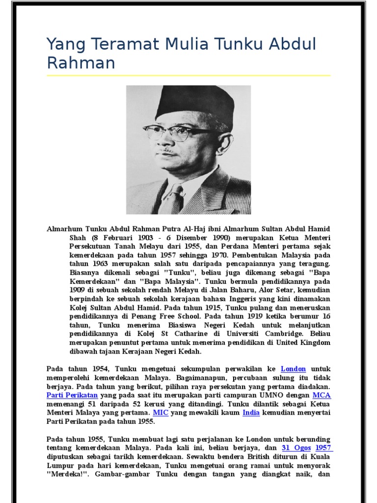 Tunku abdul rahman adalah putra dari sultan abdul halim halimshah sultan kedah yang ke 24. Sumber arkib negara. Tunku abdul rahman putra al haj ibni almarhum sultan abdul hamid halim shah 8 februari 1903 6 disember 1990 merupakan ketua menteri persekutuan tanah melayu dari 1955 dan perdana menteri pertama sejak kemerdekaan pada tahun 1957 sehingga 1970. Tunku abdul rahman putra al haj tun abdul razak tun husin onn.