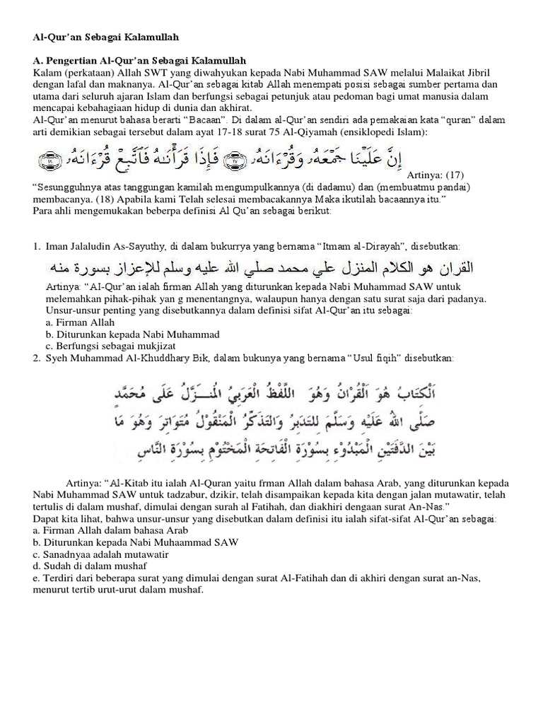 Selain itu al quran juga merupakan sebuah sumber pedoman hidup dan sumber hukum utama dalam ajaran agama islam. Juga berisi tentang wahyu wahyu allah swt yang diturunkan pedada nabi muhammad saw lewat perantaraan malaikat jibril. Dr subhi al shalih pengarang kitab mabahits fi ulumil qur an mengemukakan bahwa pendapat yang paling kuat adalah lafadz al qur an itu masdar dan sinonim murodif dengan lafadz qiro ah sebagaimana tertulis dalam qur an surat al qiyamah ayat 17 18. Al qur an itu wahyu illahi yang diturunkan kepada muhammad yang telah disampaikan kepada kita umatnya dengan jalan mutawatir yang dihukumi kafir orang yang meriwayatkannya.