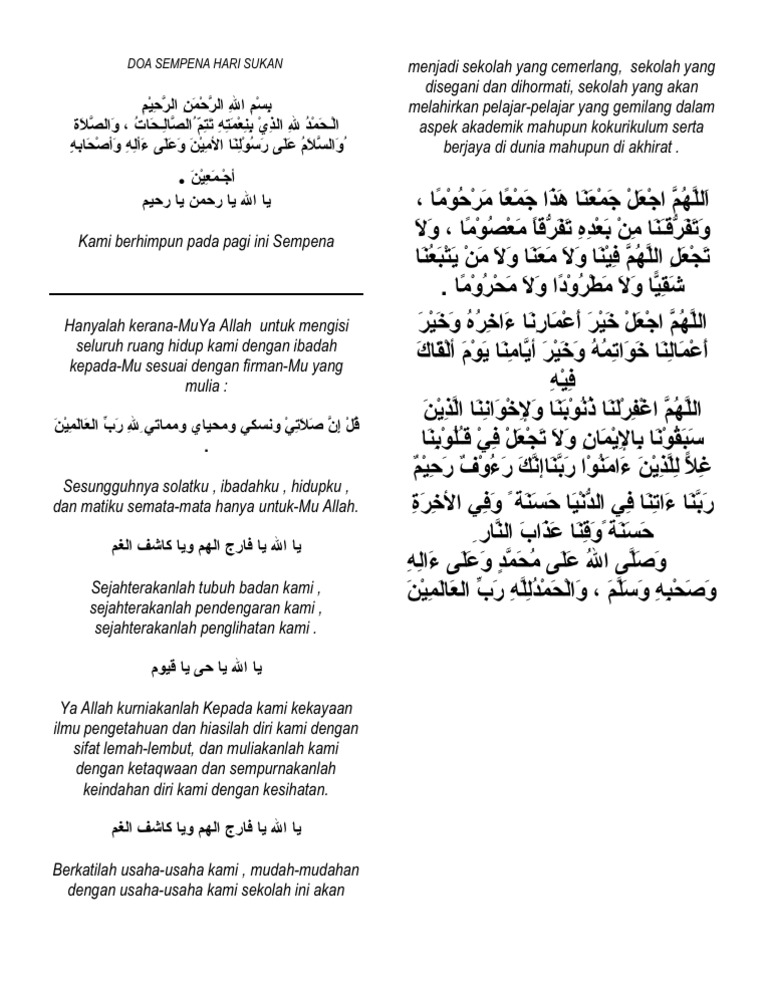Berikut merupakan doa sempena hari sukan sekolah boleh juga diubah untuk jadi doa lain contohnya doa hari perhimpunan sekolah doa majlis akhir tahun doa kem kecemerlangan doa sambutan kemerdekaan atau sambutan2 yang lain. Bacaan doa pada awal majlis merupakan suatu perkara yang wajib dilakukan dalam setiap acara atau majlis rasmi sekolah. Ujian bulan september bmt5 top 10 sources of veggie protein. Doa hari kokurikulum senamrobikton.
