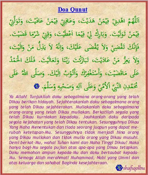 Rasulullah saw hanya pernah sekali saja membaca do a qunut di waktu shalat subuh selama hidupnya. Pendapat sebagian ulama yang menganggap do a qunut ini penting dianut oleh nu. Sunat membaca al fatihah dengan suara yang kuat pada tempat tempat yang ditentukan iaitu pada dua rakaat yang pertama solat maghrib isyak dan subuh solat jumaat dua hari raya gerhana bulan minta hujan tarawih witir di dalam bulan ramadhan dan solat untuk mengerjakan tawaf kalau dikerjakan pada waktu malam dan subuh. Terlupa untuk baca doa qunut perkara ini sering berlaku kepada kita ketika solat subuh iaitu terlupa untuk baca doa qunut dan terus sujud.