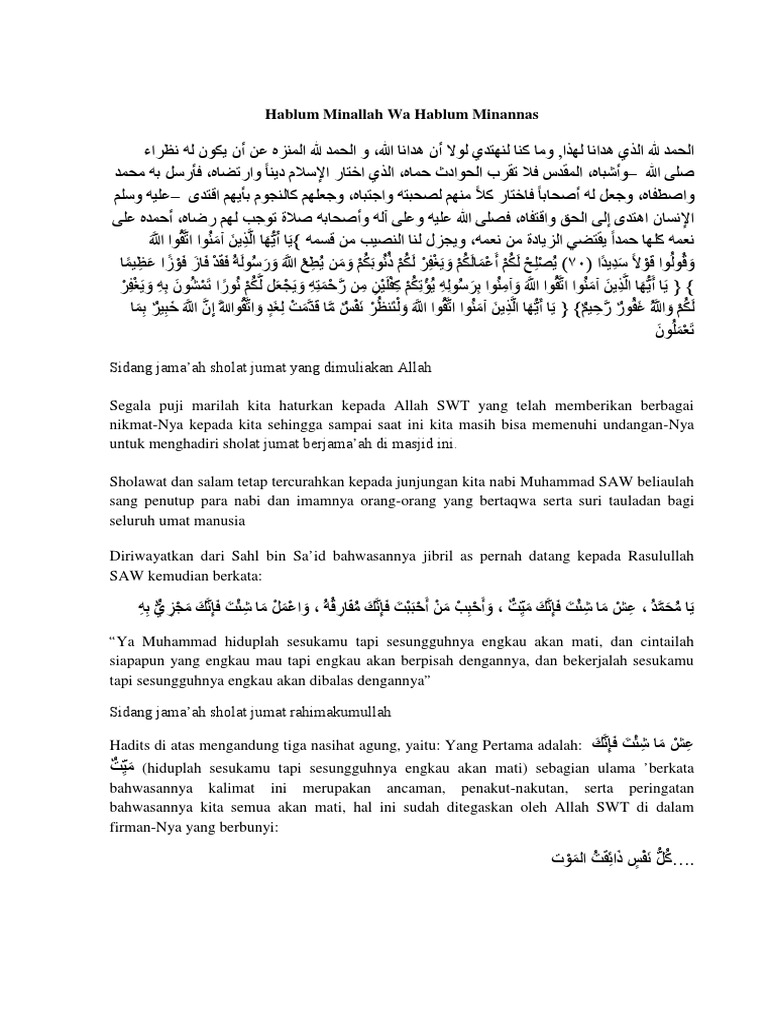 Hablum minalloh wa hablum minannas wujud dari hablumminallah dan hablumminannas yang baik adalah akhlak yang baik terhadap sesama manusia. Edisi 5 khutbah jumat terbaru 2017 hablum minallah wa hablum minannas. الحمد لله الذي هدانا لهذا وما كنا لنهتدي لولا أن هدانا الله و الحمد لله المنزه عن أن يكون له نظراء وأشباه المقدس فلا تقرب الحوادث حماه.