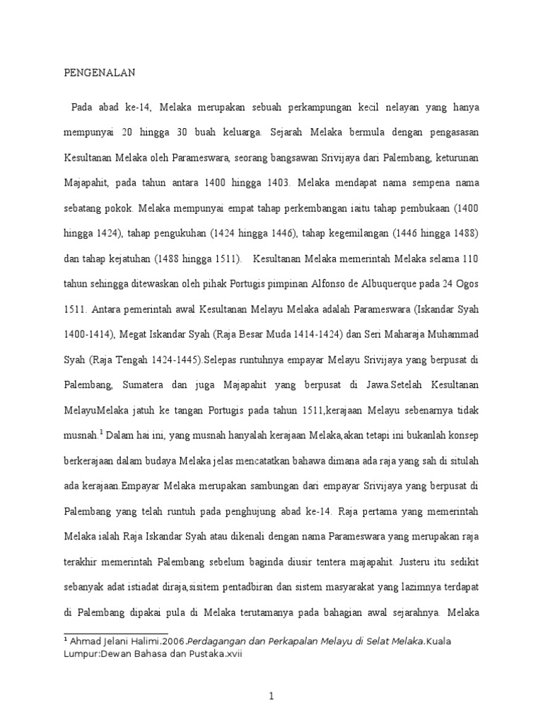 Srivijaya merupakan sebuah kerajaan maritim dan mengendalikan perdagangan. Kesultanan melayu melaka menjadi asas kerajaan masa kini huraian sukatan pelajaran sejarah tingkatan 1 kbsm barat dan sabah hadirnya aspek ini di dalam sukatan sejarah tingkatan1 telah cukup membuktikan bahawa kesultanan melayu melaka merupakan perkara yang mesti difahami dengan jelas seawal awal pemahaman sejarah tanah air. Parameswara merupakan seorang putera raja dari palembang. Daripada zaman kesultanan melayu melaka banyak pengajaran yang dapat diambil dan diamalkan dalam memajukan pentadbiran negara pada masa kini.