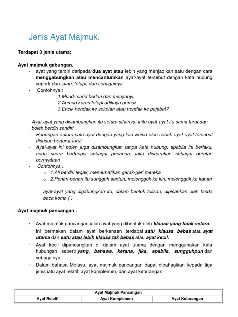 Contoh jenis ayat majmuk contoh juknis penggalang contoh jenis paragraf deduktif dan induktif contoh jenayah siber contoh jendela rumah contoh jendela kayu contoh juknis penggalang se jawa barat contoh juknis kinerja tenaga kesehatan pdf jenis dan contoh teks eksposisi jenis jenis dan contoh aplikasi komputer. Panduan pengajaran pend jasmani thn 2 azzam yusof. Ii ayat majmuk pancangan ayat utama atau ayat induk dan satu atau beberapa ayat kecil lain yang dipancangkan dalam ayat induk. Ayat majmuk keterangan dibina untuk pelbagai tujuan dengan menggunakan kata hubung kata hubung yang tertentu mengikut kesesuaian penggunaannya di dalam konteks ayat.