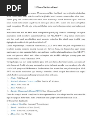 25 nama nama nabi dan rasul salah satu rukun iman yang wajib diyakini adalah iman kepada rasul nabi allah. 4 nama kitab suci dan nabi penerimanya serta penjelasannya didalam islam telah disebutkan terdapat 4 kitab suci yang diterima para nabi dan rasul dan wajib untuk kita imani. 24 karena itulah dalam sejarah manusia jumlah nabi dan rasul yang telah allah utus sangat banyak. Jumlah nabi sendiri sangat banyak mencapai ratusan ribu.