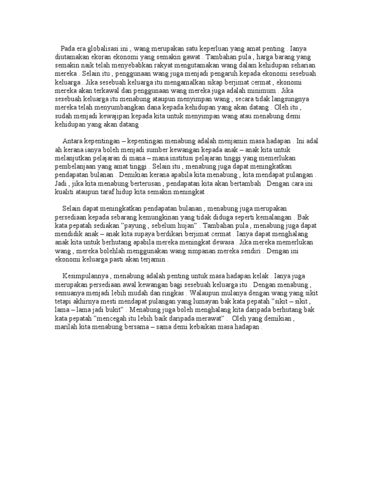 Oleh sebab itu kita perlu merancang segala perbelanjaan harian. Di era globalisasi dan modenisasi ini kebaikan amalan menabung dalam kalangan masyarakat tidak dapat disangkal lagi. Kita hendaklah membawa bekalan air dan makanan ke sekolah. Panjangnya huraian hendaklah antara 200 hingga 250 patah perkataan.