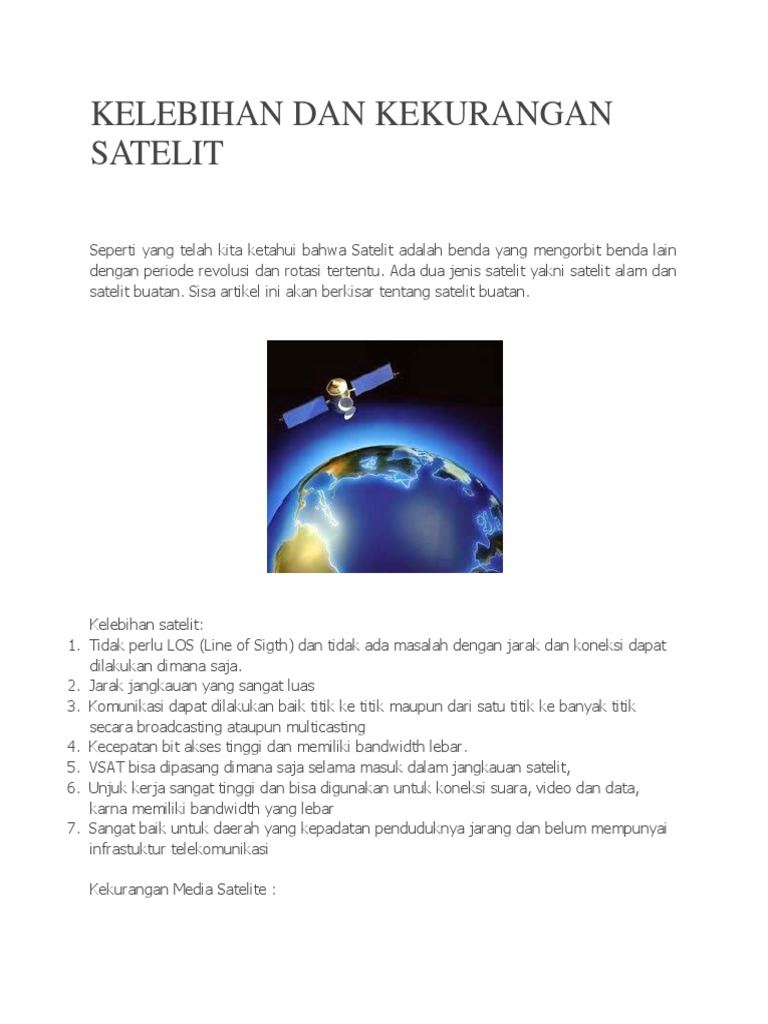 Kebaikan dan keburukan teknologi satelit. Pembangunan infrastrukturnya relatif cepat untuk daerah yang luas dibanding teresterial 4. Semoga sampai sini anda sudah cukup mengerti pengertian satelit. Pandu arah dan penentu kedudukan adalah salah satu aplikasi satelit yang telah berjaya menghasilkan peningkatan dalam produktiviti dan kejituan sebilangan besar industri. Kebaikan teknologi satelit 1.