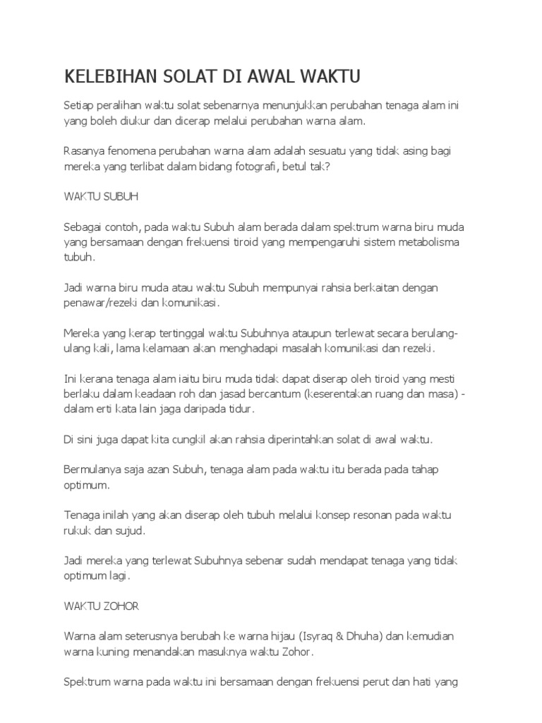 Kelebihan solat subuh di awal waktu. Jadi mereka yang terlewat subuhnya sebenar sudah mendapat tenaga yang tidak optimum lagi. Antara rahsia dan kelebihan solat di awal waktu kepentingan solat di dalam rukun islam kita merupakan rukun yang kedua setelah mengucap kalimah syahadah. Tenaga inilah yang akan diserap oleh tubuh melalui konsep resonan pada waktu rukuk dan sujud. Solat adalah tiang agama.