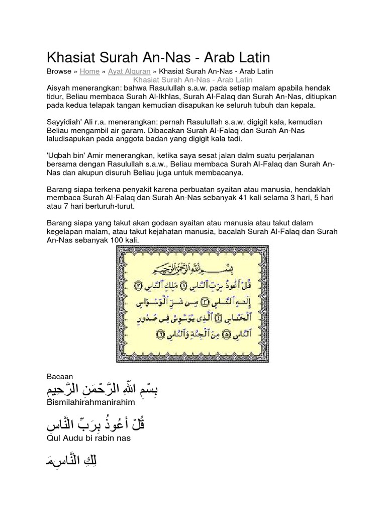 Nama an nas diambil dari kata an nas yang berulang kali disebut dalam surat ini yang artinya manusia. Kelebihan surah an nas 1. Ia terdiri daripada enam ayat dan tergolong dalam surah makkiyyah turun sebelum hijrah. Keutamaan dan keajaiban surah an nas surah an nas ini termasuk golongan surat makkiyah turun sebelum hijrah menurut pendapat para ulama di bidang tafsir diantaranya ibnu katsir asy syafi i dan asy syaikh abdurrahman as sa dy.