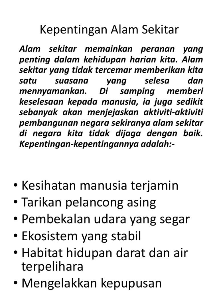 Alam sekitar yang tidak tercemar memberikan kita suasana yang selesa dan menyamankan. Di samping memberi keselesaan kepada manusia ia juga sedikit sebanyak akan menjejaskan aktiviti aktiviti pembangunan negara sekiranya alam sekitar di negara kita tidak dijaga dengan baik. Sikap tidak bertanggungjawab segelintir manusia yang membuang sisa sisa yang tidak sepatutnya ke dalam sungai dan laut telah menyebabkan insiden yang tidak diingini berlaku. Alam sekitar memainkan peranan penting dalam kehidupan harian kita alam sekitar yang tidak tercemar memberikan kita satu suasana yang selesa dan menyamankan di samping itu ia memberi keselesaan kepada manusia ia juga sedikit sebanyak akan menjejeskan aktiviti aktiviti pembangunan negara sekiranya alam sekitar tidak dijaga dengan baik dalam usaha kita untuk mengejar.