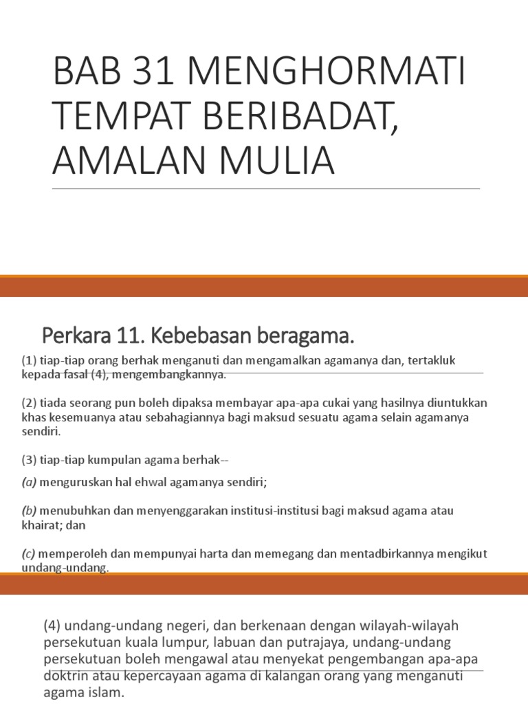 K11 2 5 menyatakan keperluan memahami adab ketika berada di rumah ibadat. Menurutnya rakyat tanpa mengira latar belakang bangsa dan agama perlu menolak sebarang perjuangan agama yang keterlalun bagi mengelak perbalahan dan menimbulkan huru hara sehingga menjadi ancaman kepada keamanan serta. Perpaduan masyarakat di malaysia. Di malaysia permasalahan antara kaum sering kali dilihat kerana perbezaan anutan agama sekaligus membawa perbezaan budaya dan perbezaan ini pula mampu menjadi jurang besar jika tidak diatasi dengan bijaksana.