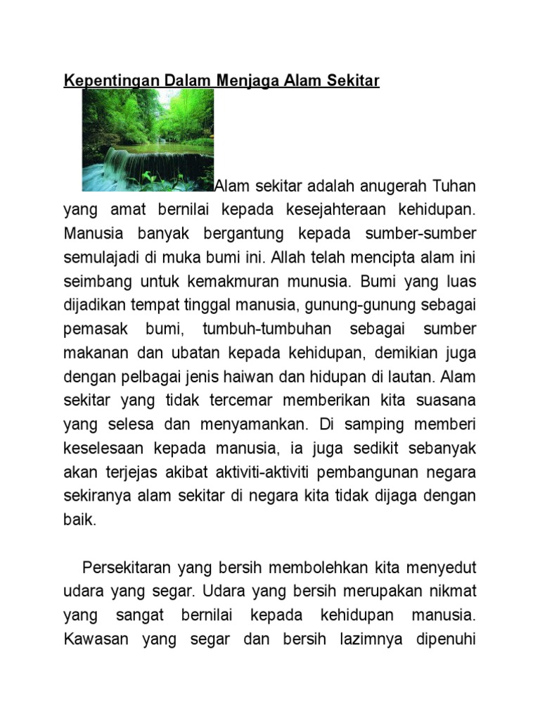 Alam sekitar masa kini semakin tercemar kerana terdapat pihak pihak yang tidak bertanggungjawab telah melakukan pencemaran seperti pembuangan sampah di sungai sungai penggunaan baja baja. Di samping memberi keselesaan kepada manusia ia juga sedikit sebanyak akan terjejas akibat aktiviti aktiviti pembangunan negara sekiranya alam sekitar di negara kita tidak dijaga dengan baik. Di samping memberi keselesaan kepada manusia ia juga sedikit sebanyak akan menjejaskan aktiviti aktiviti pembangunan negara sekiranya alam sekitar di negara kita tidak dijaga dengan baik. Alam sekitar adalah anugerah tuhan yang amat bernilai kepada kesejahteraan kehidupan.