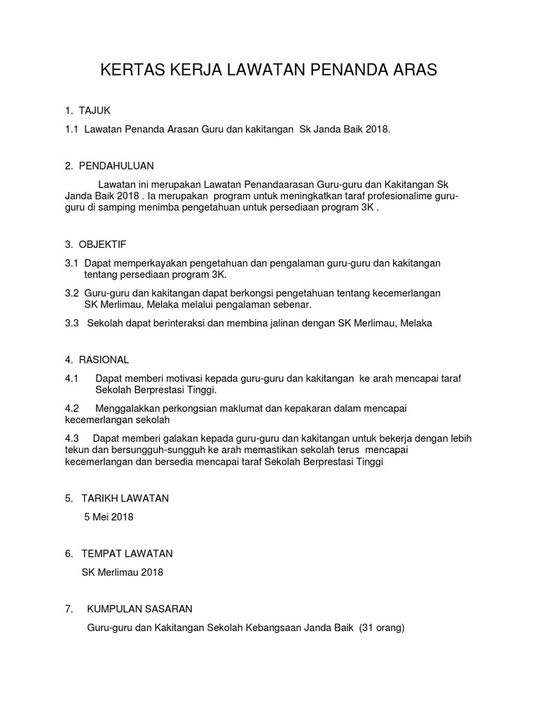 Program lawatan penanda aras ke sekolah cemerlang pusat sumber sekolah di daerah klang selangor merupakan satu program yang dirangka khas untuk berkongsi pengalaman dan kepakaran dalam pengurusan pendidikan dan membuat penambahbaikan selepas lawatan. Lawatan ke muzium sultan abu bakar johor bahru. Kertas kerja lawatan penanda arasan. 2 0 tujuan kertas kerja kerja kerja ini disediakan untuk memohon kelulusan serta sumbangan bagi mengadakan program sepertimana dinyatakan di bawah.