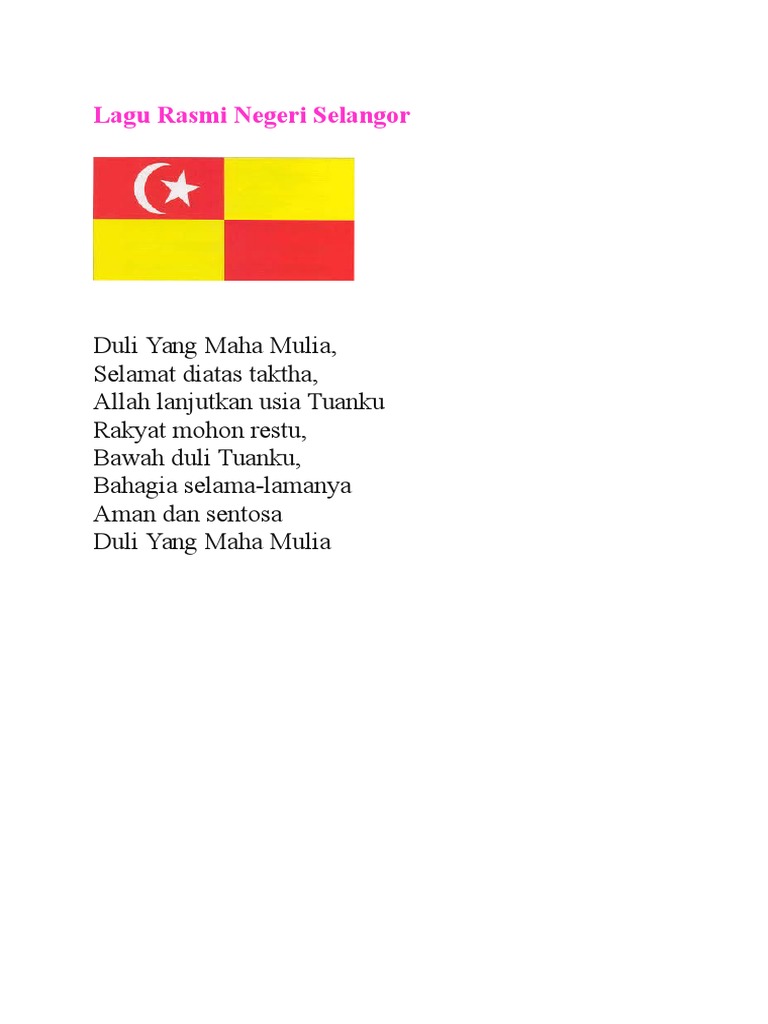 Lirik lagu negeri selangor duli yang maha mulia selamat di atas takhta allah lanjutkan usia tuanku rakyat mohon restu bawah duli tuanku bahagia selama lamanya aman dan sentosa duli yang maha mulia.
