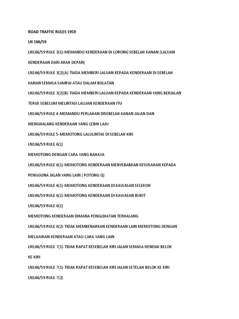 Ln 166 59 rule 31. Ln 166 59 traffic signs size colour and type rules 1959 ln 167 59 motor vehicles construction and use rules 1959 ln 170 59 motor vehicle registration and licensing rules 1959 l n. 16 3 ln 166 59 1 1 6 meletakkan kenderaan dalam lingkungan 30 kaki daripada simpang atau selekoh jalan. Dengan mendakwanya di bawah kaedah 8 1 ln 166 59 yang berbunyi at an intersection where the road is marked into 3 traffic lanes the nearside lane shall be used only by vehicles turning left the centre lane shall be used only by vehicles travelling straight ahead and the offside lane shall be used only by vehicles turning right maka pihak pendakwa raya harus membuktikan bahawa wujud.