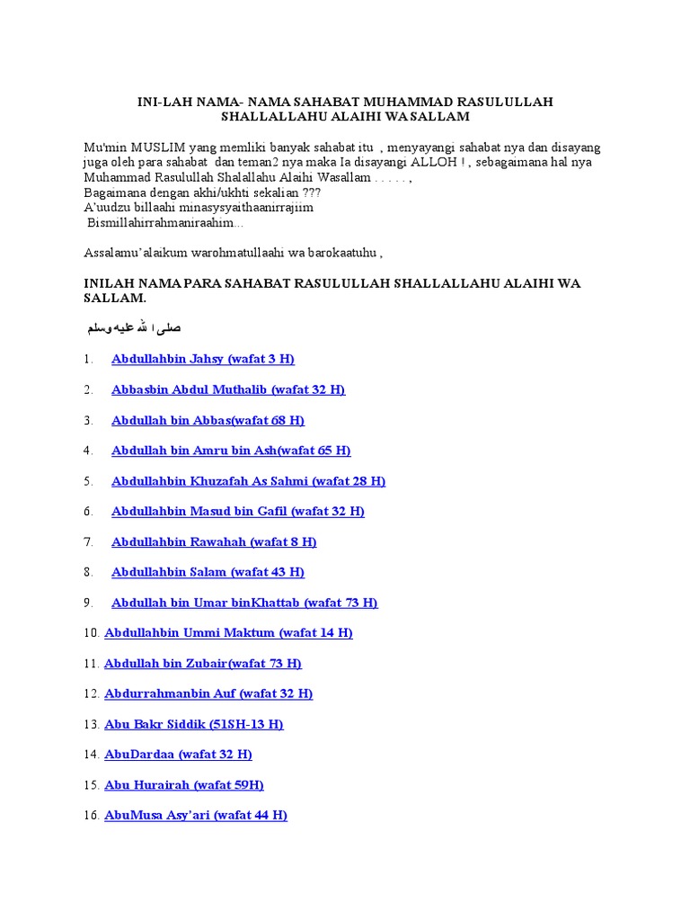 Nama sahabat nabi yang memiliki doa agar sang anak menjadi seorang manusia yang bijaksana riang gembira dan bersinar terang semasa kehidupannya. Namun berdasarkan keterangan imam ar razi dan ini merupakan pendapat yang paling masyhur jumlah sahabat lebih dari 100 ribu dari kalangan laki laki dan perempuan. Nama keterangan 1 mush ab bin umair. Gelar sahabat nabi laqab atau gelar adalah julukan yang diberikan oleh rasulullah maupun oleh.