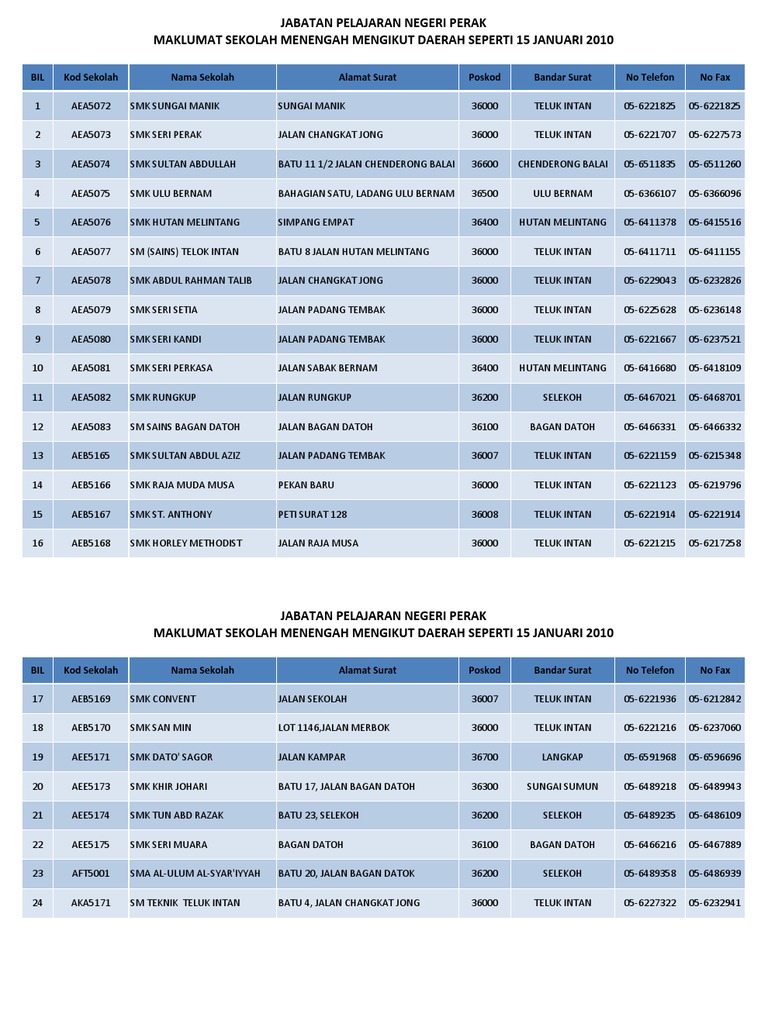 Perak ppd hilir perak aea5078 smk abdul rahman talib jalan changkat jong teluk intan 36000 056216070 056232826. Find postcode or nearby post office by location road and district. Teks disediakan dengan lesen creative commons. Browse location perak.