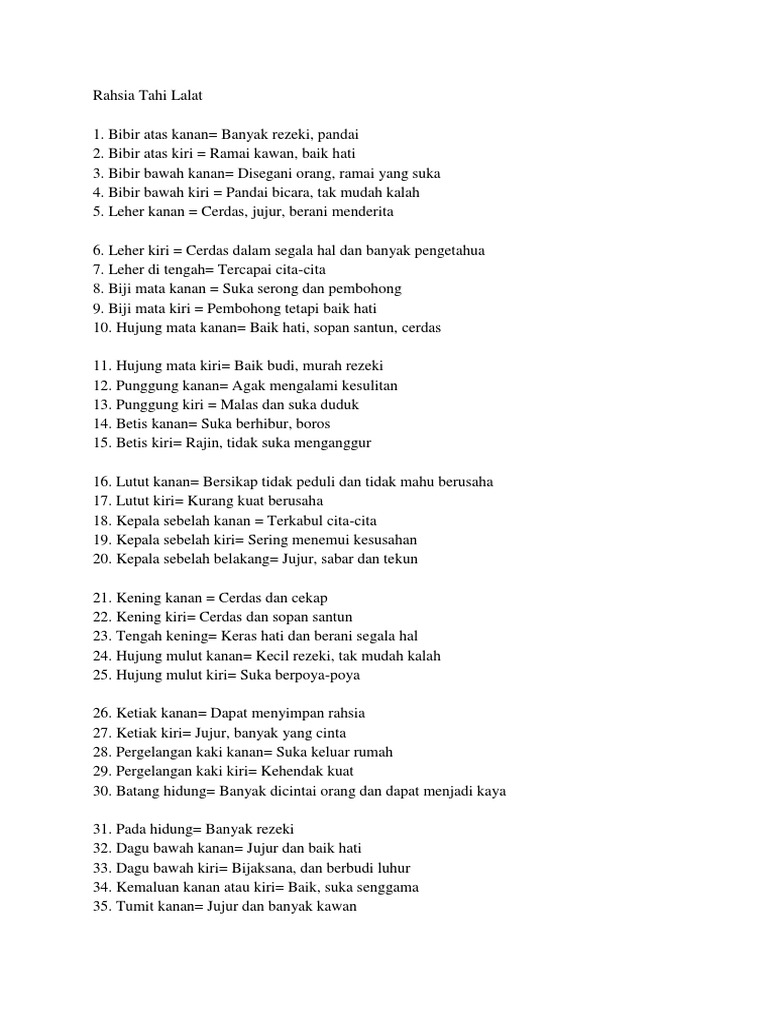 7 watak orang pemilik tahi lalat di leher pundak kanan kiri dada buah dada dan atas ulu hati. Dan sekarang ini untuk menghilangkan tahi lalat tanpa bekas sangatlah mudah yang saat ini banyak di lakukan oleh masyarakat untuk menghilangkan tahi lalat iaitu dengan melakukan pembedahan plastik. Namun begitu ia biasa diajarkan di kalangan masyarakat melayu hanyalah sekadar menambah pengetahuan. Tahi lalat di lutut sebelah dalam lipatan belakang lutut hatinya tidak tetap.