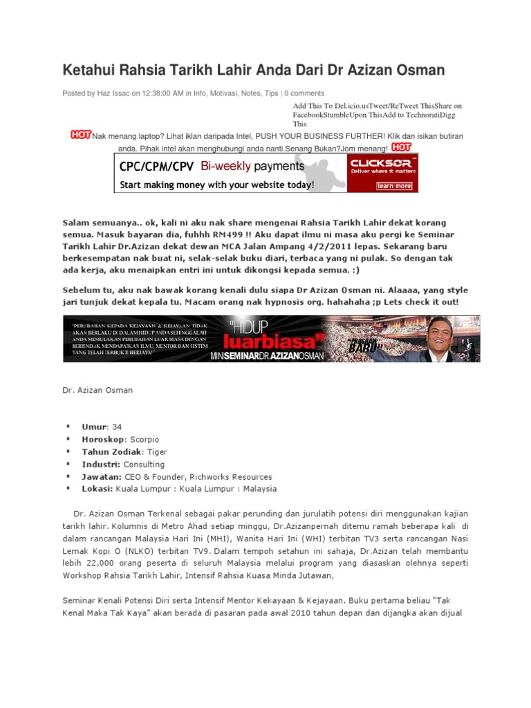 Dr azizan osman adalah antara 100 usahawan paling berpengaruh 2017 di malaysia yang diiktiraf oleh icg international coach guild sebagai jurulatih perniagaan dan pemasaran bertaraf dunia serta jurulatih kepimpinan eksekutif yang diiktiraf oleh berkeley executive coaching institute berkeley university amerika syarikat. Aku dapat ilmu ni masa aku pergi ke seminar tarikh lahir dr azizan dekat dewan mca jalan ampang 4 2 2011 lepas. Mula2 nk buat ni mmg payah skit a pasal macam berbelit tp alah tegal kan slow2 la study and aku faham gak akhirnya.