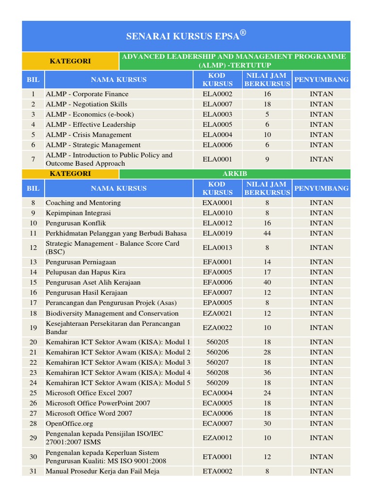 Senarai kursus untuk penjawat awam. Penampilan diri eea0004 1 intan 27 nilai dan etika eea0003 18 intan kategori hal ehwal islam bil nama kursus. Negara boleh dipertimbangkan untuk mengikuti kursus jangka panjang di luar negara selepas genap dua tahun tamat mengikuti kursus berkenaan. Pengurusan stres dalam kalangan penjawat awam. Untuk tujuan log latihan pengelasan program latihan dipecahkan kepada 4 kumpulan iaitu.