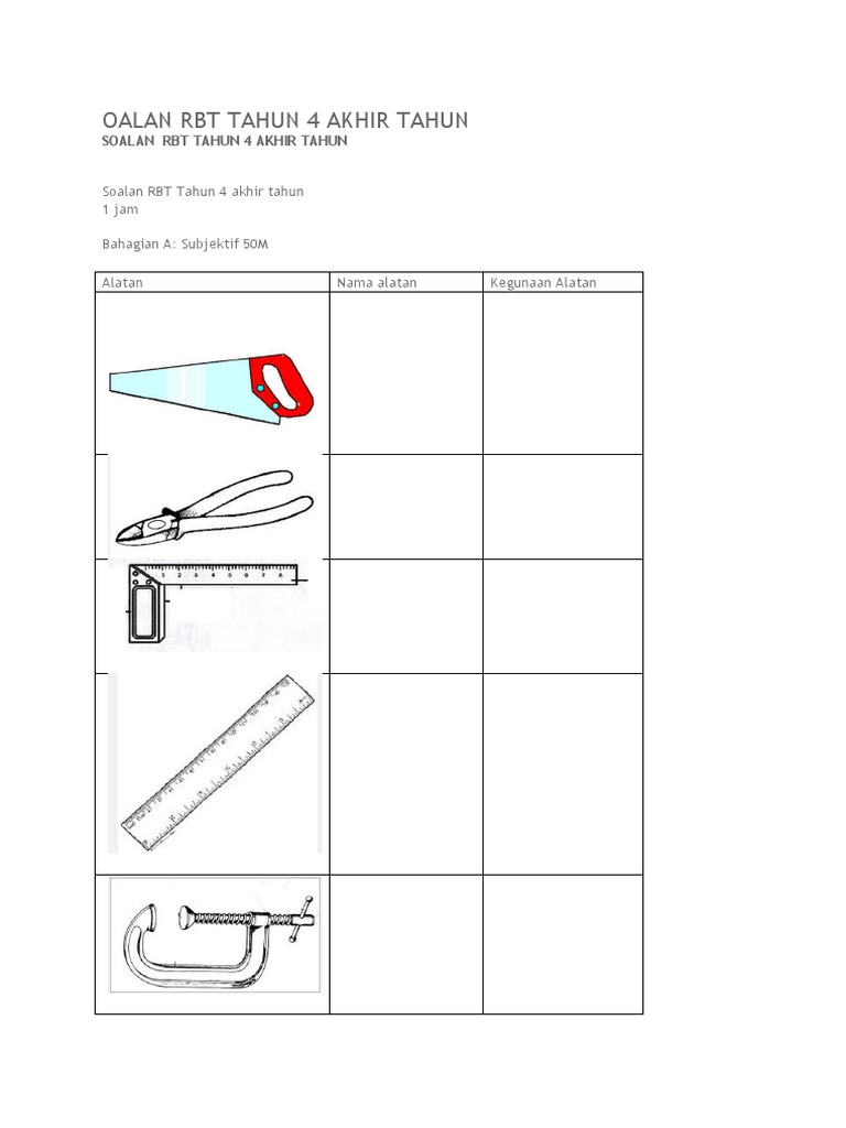 Pat rbt tahun 4 1. Kertas soalan tmk t5 doc. Kertas soalan rbt t5 doc. Subjektif 50m alatan nama alatan kegunaan alatan 2.