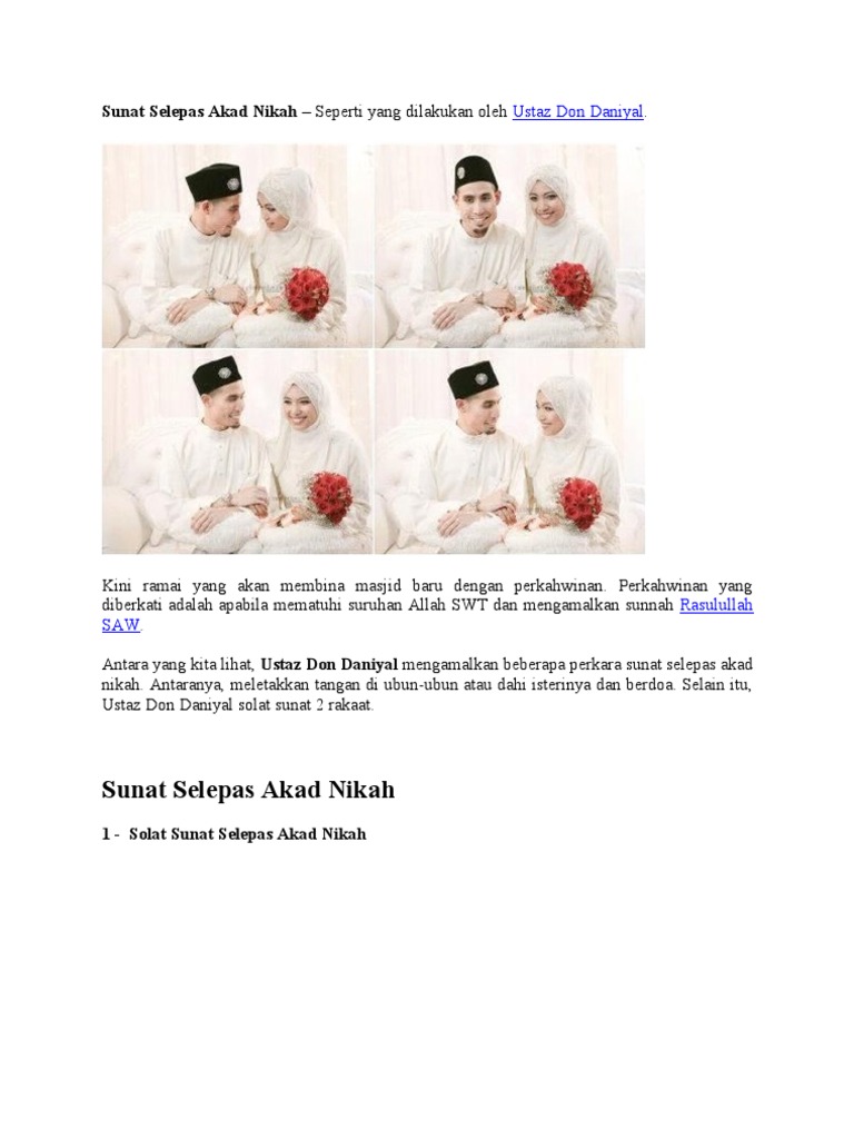 Solat sunat selepas nikah ustaz don. Solat sunat selepas akad nikah lafaz niat. Cuma ia dibezakan dengan niatnya lafaz niatnya solat sunat nikah ialah. Sepatutnya solat sunat selepas akad nikah tidak ada ianya perkara baru. Info lebih jelas di sini.
