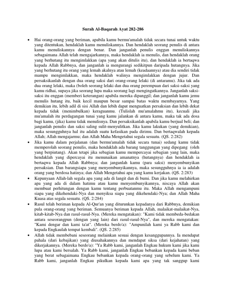 Terjemahan al qur an surat al baqarah ayat 282 sampai dengan surat al baqarah ayat 286 sebagai berikut. Tafsir surat al baqarah ayat 282 286 ayat ke 282. Seluruh ayat dari surat al baqarah termasuk golongan madaniyyah merupakan surat yang terpanjang diantara surat surat al qur an yang didalamnya terdapat pula ayat yang terpanjang ayat 282. Listen surah baqarah audio mp3 al quran on islamicfinder.