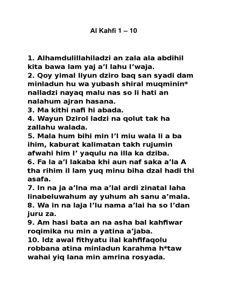 A man recited al kahf and there was an animal in the house which began acting in a nervous manner. Surah al khafi ayat 1 10 puji syukur kepada alloh tuhan sekalian alam yang memberi masa kepda kita sehingga kita dapat bersua kembali di blog wirid dan doa ni. Kali ini kami akan membahas tentang surat al kahfi ayat 1 10. Qay yi man li yun zi ra ba sans sha dee dam mil la dun hu wa yu bash shi ral mu mi nii nal lazi na yak ma luu nas soo li haa ti an na la hum aj ran kha sana 3.