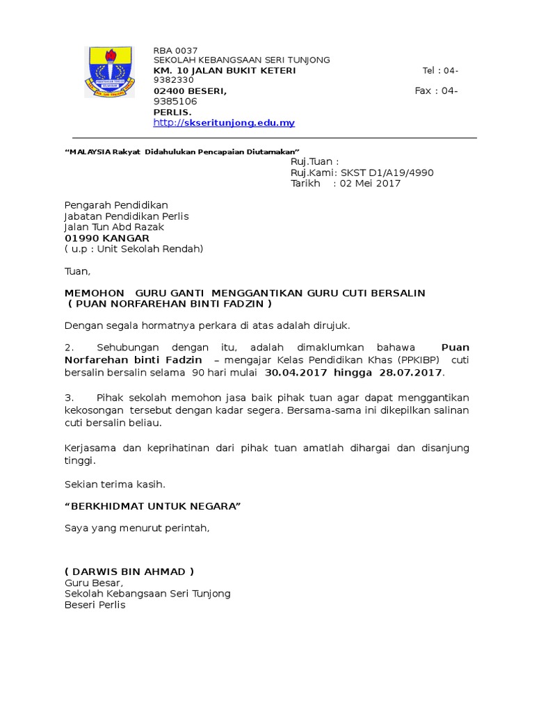 Contoh surat rasmi mohon cuti bersalin swasta contoh surat rasmi mohon cuti bersalin 3. Contoh surat makluman latihan murid dan raptai su. Khidmat guru ganti akan tamat apabila guru yang diganti telah tamat tempoh bercuti atau berkursus dan kembali bertugas di. Mohd ali bin sulaiman no.