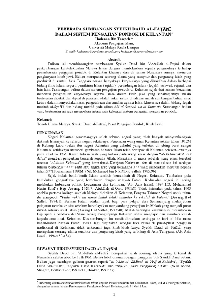Seorang ulama bernama syeikh daud bin abdullah al fatani yang membawa nafas baru dalam keintelektualan islam di wilayah patani. The maintenance of an islamic tradition jan 1988. Syeikh daud bin abdullah al fatani. Syeikh daud bin abdullah al fatani juga seorang ulama patani yang bermukim di makkah dan banyak menulis kitab kitab agama.