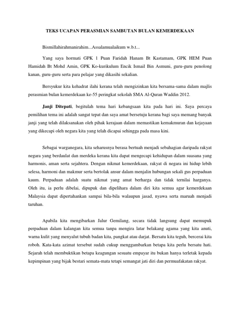 Teks ucapan hari kemerdekaan. Teks ucapan pelancaran program nilam. 17 agustus itu bukan hanya sekedar balap karung saja main petasan atau konvoi berkeliling kota. Teks ucapan hari kemerdekaan. Terlebih dahulu saya merakamkan ucapan terima kasih kepada yang berbahagia tuan pengetua kerana memberi laluan kepada saya untuk berucap sepatah dua kata bersempena sambutan kemerdekaan ke 55 tahun.