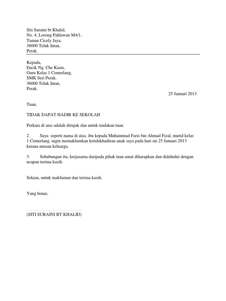 Urusan keluarga cara menulis surat tidak hadir ke sekolah. Surat kiriman rasmi seperti surat tidak hadir ke sekolah adalah perutusan surat yang formal biasanya ia ditulis oleh individu atau sekumpulan individu yang mempunyai tujuan atau hasrat yang sama dan ditujukan kepada individu pertubuhan institusi kementerian badan berkanun atau jabatan kerajaan atau swasta yang berkenaan di mana pengirim tidak mengenali identiti penerimanya. Cara menulisnya mestilah dengan format surat rasmi kerana yang hendak menerimanya adalah pihak sekolah yang merupakan institusi rasmi malaysia. 2 jangan sesekali menipu dalam memberikan punca dan sebab anda tidak hadir ke sekolah. Semoga dengan contoh surat rasmi tidak hadir ke sekolah ini dapat membantu anda untuk menulis surat sendiri tanpa perlukan bantuan orang lain.